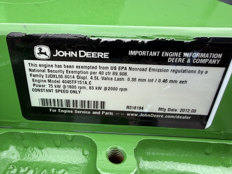 (NEW) 2012 John Deere Diesel Engine 4045TF151 (POWERTECH) Engine Model: 4045TF151A, Engine Family: 2JDXL06.8014, 4.5L, Customer Number: M45TG3-MC2, 115HP @ 2500 RPM, Engine Serial S/N: PE4045T867747. ...